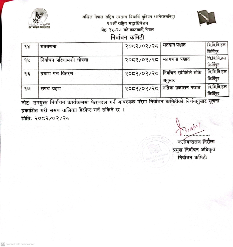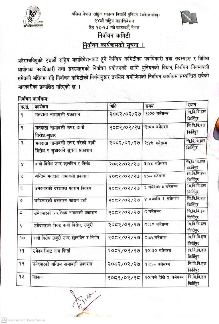अनेरास्ववियुको नेतृत्वमा सुजन कडरियाको नाम प्रस्ताव भएपछि हलमै नाराबाजी भएको थियो । नाराबाजीपछि निर्वाचन समितिले निर्वाचन कार्यतालिका सार्वजनिक गरेको हो ।