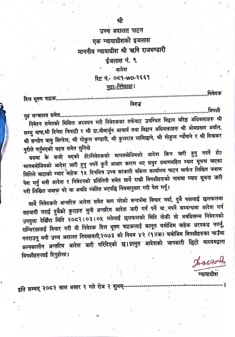 न्यायाधीश ऋषि राजभण्डारीको एकल इजलासले पाठकलाई पक्राउ नगर्न भन्दै आदेश जारी गरेको हो ।