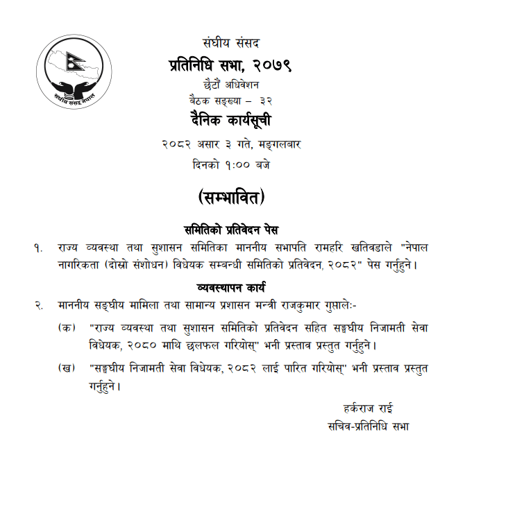 यस्तै, राज्य व्यवस्था तथा सुशासन समितिका सभापति रामहरि खतिवडाले ‘नेपाल नागरिकता (दोस्रो संशोधन) विधेयकसम्बन्धी समितिको प्रतिवेदन, २०८२’ पेस गर्ने कार्यसूची निर्धारण गरिएको छ ।