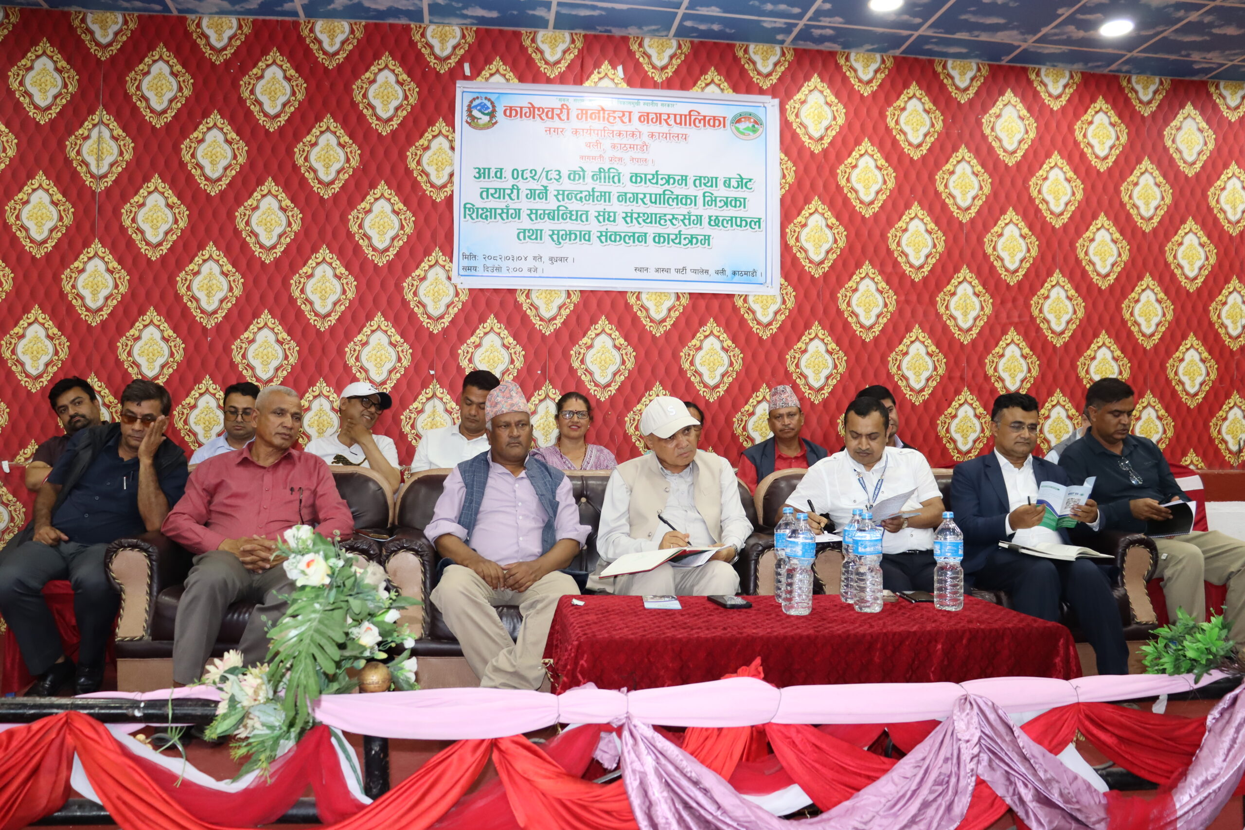 काठमाडौं, असार ५- काठमाडौंको कागेश्वरी मनोहरा नगरपालिकाले आगामी आर्थिक वर्ष २०८२-८३ को नीति, कार्यक्रम र बजेटका लागि सुझाव संकलन थालेको छ । स्थानीय तहले आगामी आर्थिक वर्षको नीति, कार्यक्रम र बजेट आगामी असार १० गतेभित्र नगर तथा गाउँसभामा पेस गरिसक्नुपर्ने छ ।