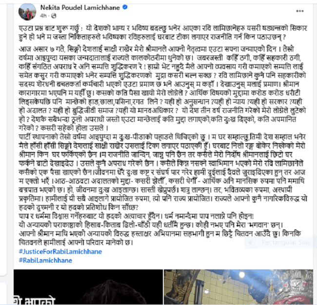 पौडेलले यो देशको भाग्य र भविष्य बदल्छु भनेर आएका रवि लामिछानेहरू यसरी षड्यन्त्रको सिकार हुने हो भने म जस्ता निकिताहरुले भविष्यका रविहरूलाई घरबाट टीका लगाएर राजनीति गर्न किन पठाउँछन् भन्दै प्रश्न गरेकी छन् ।