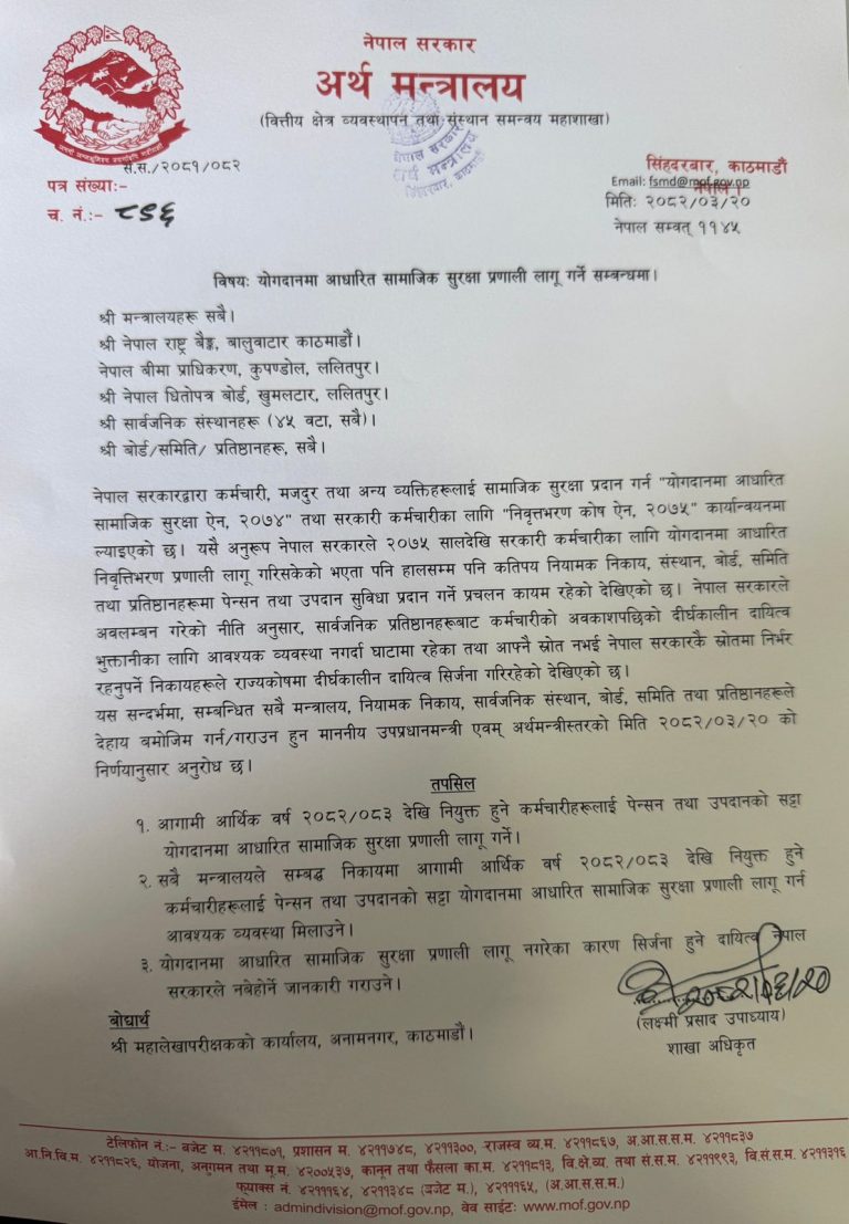 काठमाडौं । सरकारले आगामी आर्थिक वर्ष २०८२र८३ देखि नियुक्त हुने कर्मचारीलाई पेन्सन तथा उपदान नदिई त्यसको सट्टा योगदानमा आधारित सामाजिक सुरक्षा प्रणाली लागु गर्ने भएको छ ।