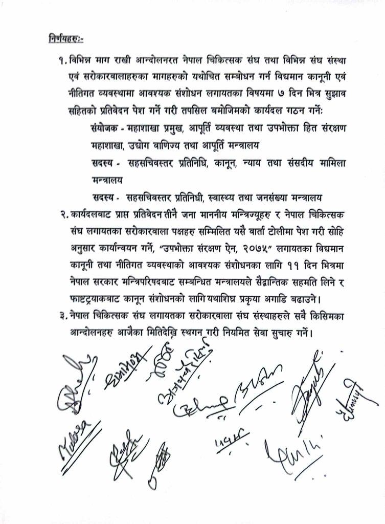 स्वास्थ्य मन्त्रालयमा संघका पदाधिकारीसहित स्वास्थ्यमन्त्री प्रदीप पौडेल, कानून मन्त्री अजय चौरसिया र उद्योगमन्त्री दामोदर भण्डारीबीच भएको छलफलपछि सहमति जुटेको हो।