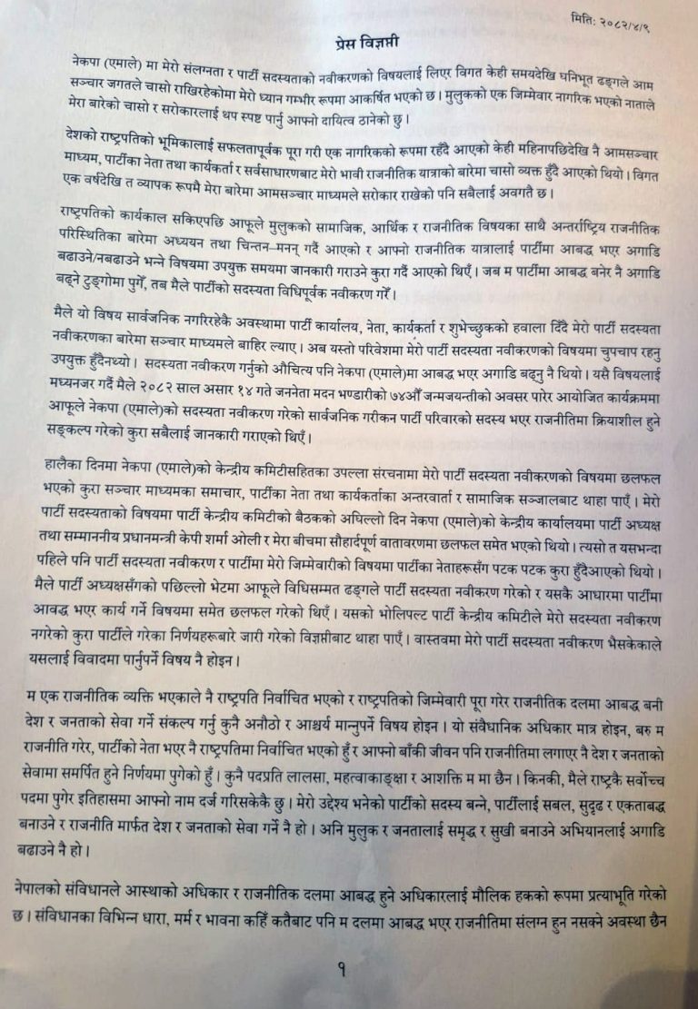 काठमाडौं । पूर्वराष्ट्रपति विद्यादेवी भण्डारीले आफूले एमालेको सदस्यता विधिपूर्वक नवीकरण गरिसकेको बताएकी छन् ।