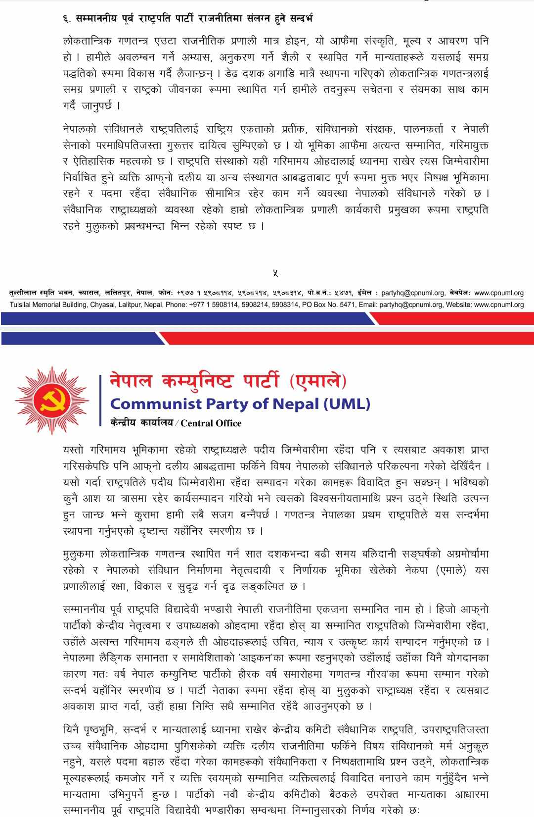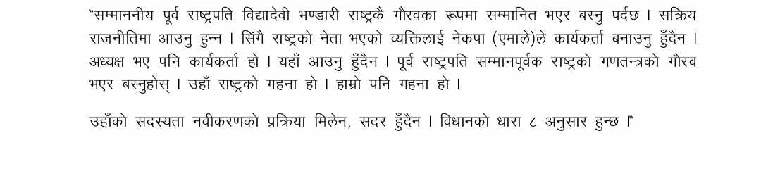 ूसम्माननीय पूर्वराष्ट्रपति विद्यादेवी भण्डारी राष्ट्रकै गौरवका रूपमा सम्मानित भएर बस्नु पर्दछ । सक्रिय राजनीतिमा आउनु हुन्न । सिंगै राष्ट्रको नेता भएको व्यक्तिलाई नेकपा ९एमाले०ले कार्यकर्ता बनाउनु हुँदैन । अध्यक्ष भए पनि कार्यकर्ता हो । यहाँ आउनु हुँदैन । पूर्वराष्ट्रपति सम्मानपूर्वक राष्ट्रको गणतन्त्रको गौरव भएर बस्नुहोस् । उहाँ राष्ट्रको गहना हो । हाम्रो पनि गहना हो, अपानिमा भनिएको छ, उहाँको सदस्यता नवीकरणको प्रक्रिया मिलेन, सदर हुँदैन । विधानको धारा ८ अनुसार हुन्छ ।