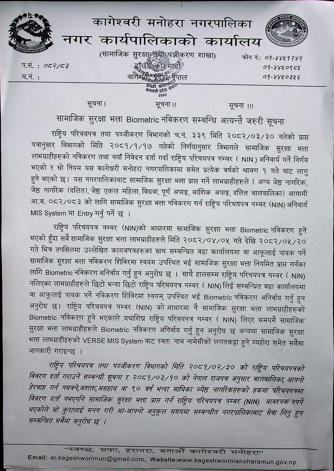 नगरपालिकाको सुचनामा भनिएको छ, “राष्ट्रिय परिचयपत्र तथा पञ्जीकरण विभागको च.नं. ३३९ मिति २०८२/०३/३० गतेको प्राप्त पत्रानुसार विभागको मिति २०८१/१/१७ गतेको निर्णयानुसार विभागले सामाजिक सुरक्षा भत्ता लाभग्राहीहरुको नविकरण तथा नयाँ निवेदन दर्ता गर्दा राष्ट्रिय परिचयपत्र नम्बर ( NIN) अनिवार्य गर्ने निर्णय भएको र सो नियम यस कागेश्वरी मनोहरा नगरपालिकामा समेत प्रत्येक वर्षको श्रावण १ गते बाट लागु हुने भएको छ । यस नगरपालिकाबाट सामाजिक सुरक्षा भत्ता प्राप्त गर्ने लाभग्राहीहरुले ( अन्य जेष्ठ नागरिक, जेष्ठ नागरिक (दलित), जेष्ठ एकल महिला, विधवा, पूर्ण अपाङ्ग, आंशिक अपाङ्ग, दलित बालबालिका) आगामी आ.ब. ०८२/०८३ को लागि सामाजिक सुरक्षा भत्ता नविकरण गर्न राष्ट्रिय परिचयपत्र नम्बर (NIN) अनिवार्य MIS System मा Entry गर्नु पर्ने छ ।