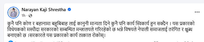 श्रेष्ठले सामाजिक सञ्जालमार्फत प्रतिक्रिया दिँदै भने– ‘कुनै पनि कोण वा बहानामा बहुविवाहलाई कानुनी मान्यता दिने कुनै पनि कार्य स्वीकार्य हुन सक्दैन।’