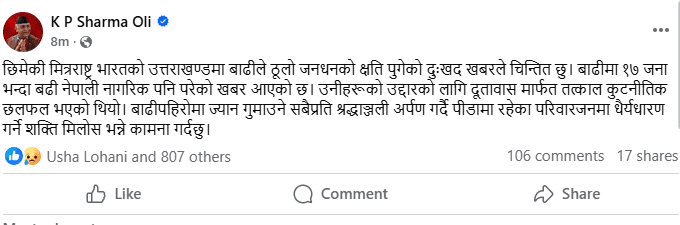 काठमाडौँ । प्रधानमन्त्री केपी शर्मा ओलीले छिमेकी मित्रराष्ट्र भारतको उत्तराखण्डमा बाढीले ठुलो जनधनको क्षति पुगेको दुःखद खबरले चिन्तित रहेको बताएका छन् ।