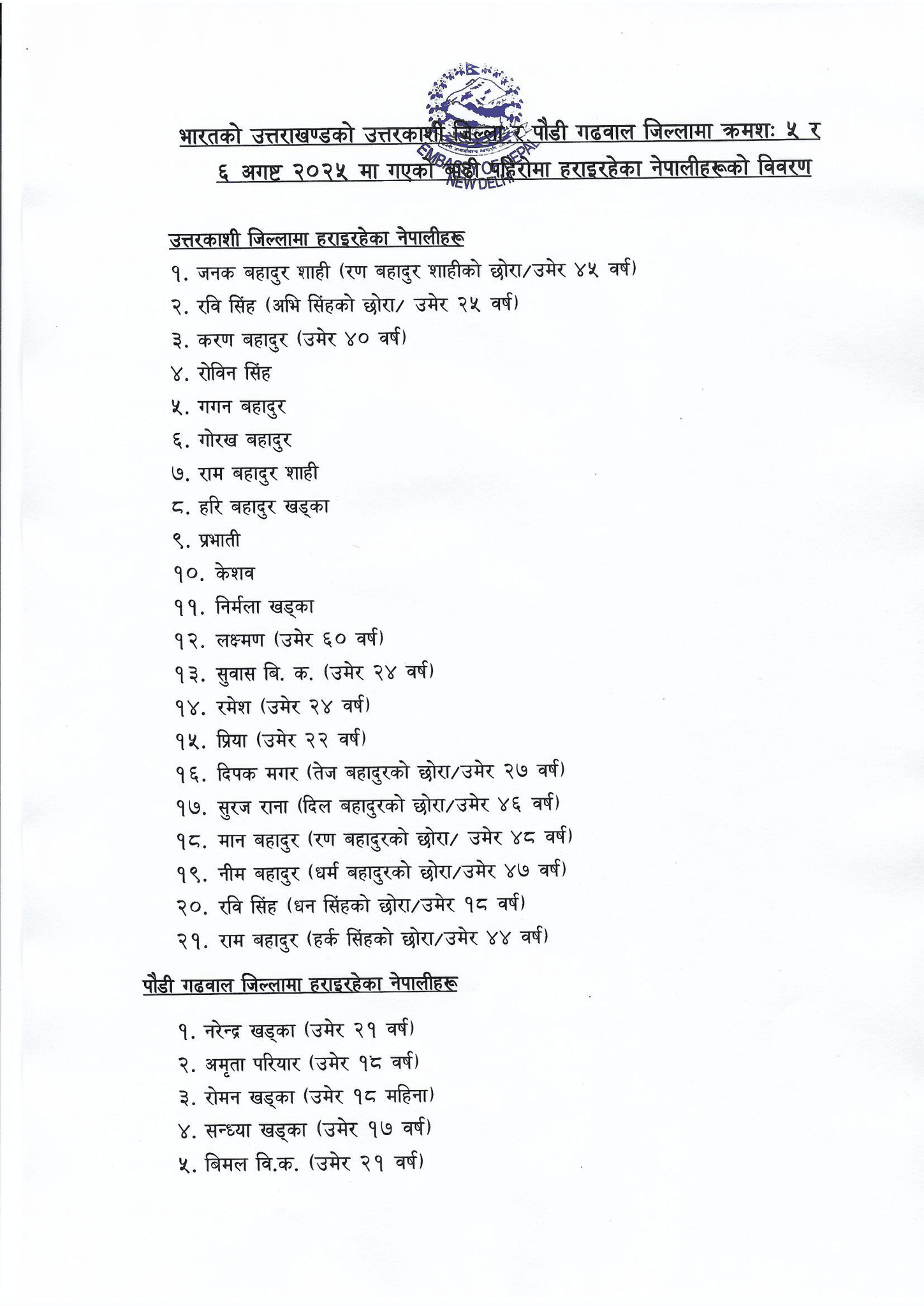 भारतस्थित नेपाली दूतावासले बेपत्ताहरूको सूची सार्वजनिक गर्दै उत्तर काशीमा २१ र पौडी गढवालमा ५ नेपाली बेपता भएको जानकारी दिएको छ ।
