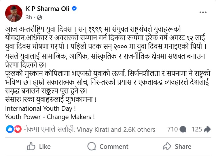 ‘आज अन्तरराष्ट्रिय युवा दिवस। सन् १९९९ मा संयुक्त राष्ट्रसङ्घले युवाहरूको योगदान, अधिकार र अवसरको सम्मान गर्ने दिनका रूपमा हरेक वर्ष अगस्ट १२ लाई युवा दिवस घोषणा गर्‍यो। पहिलोपटक सन् २००० मा युवा दिवस मनाइएको थियो। यसले युवालाई सामाजिक, आर्थिक, सांस्कृतिक र राजनीतिक क्षेत्रमा सशक्त बनाउन प्रेरणा दिएको छ’, प्रधानमन्त्रीले सामाजिक सञ्जालमा लेखेका छन्।