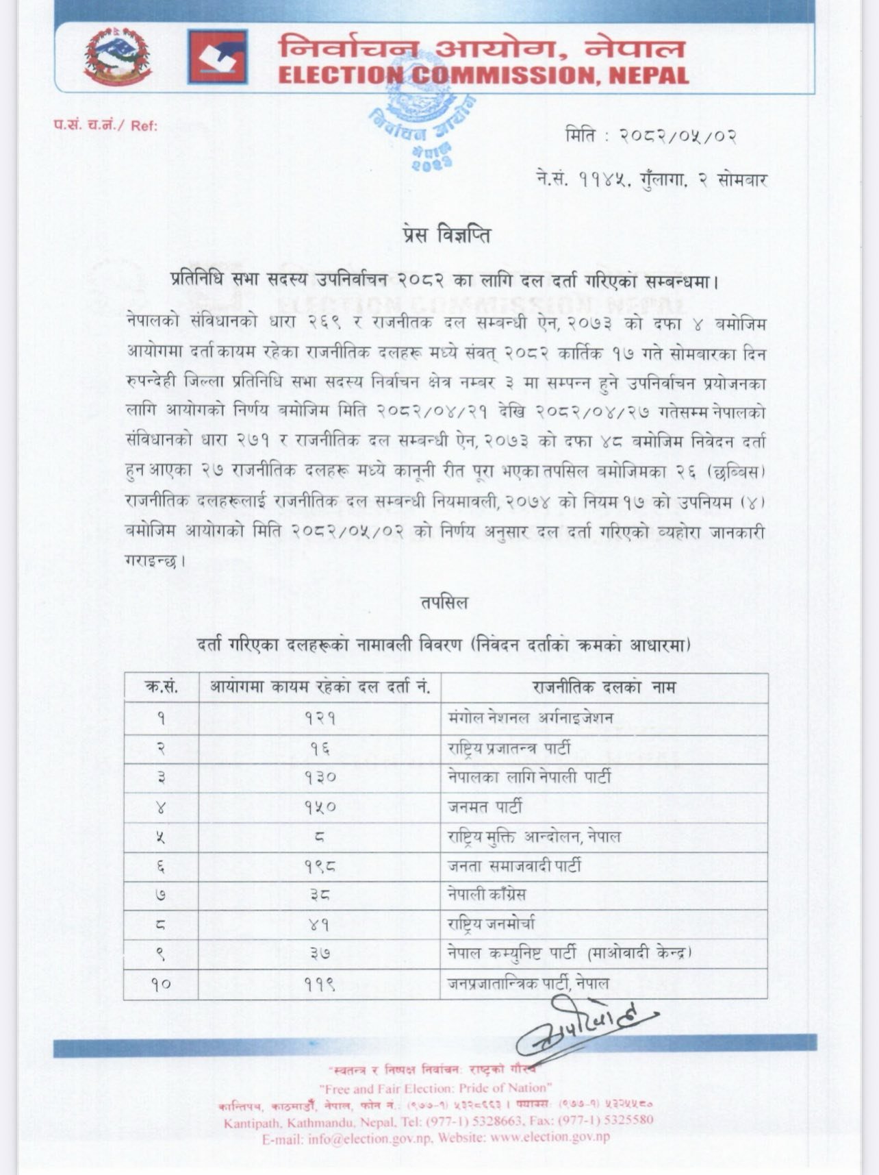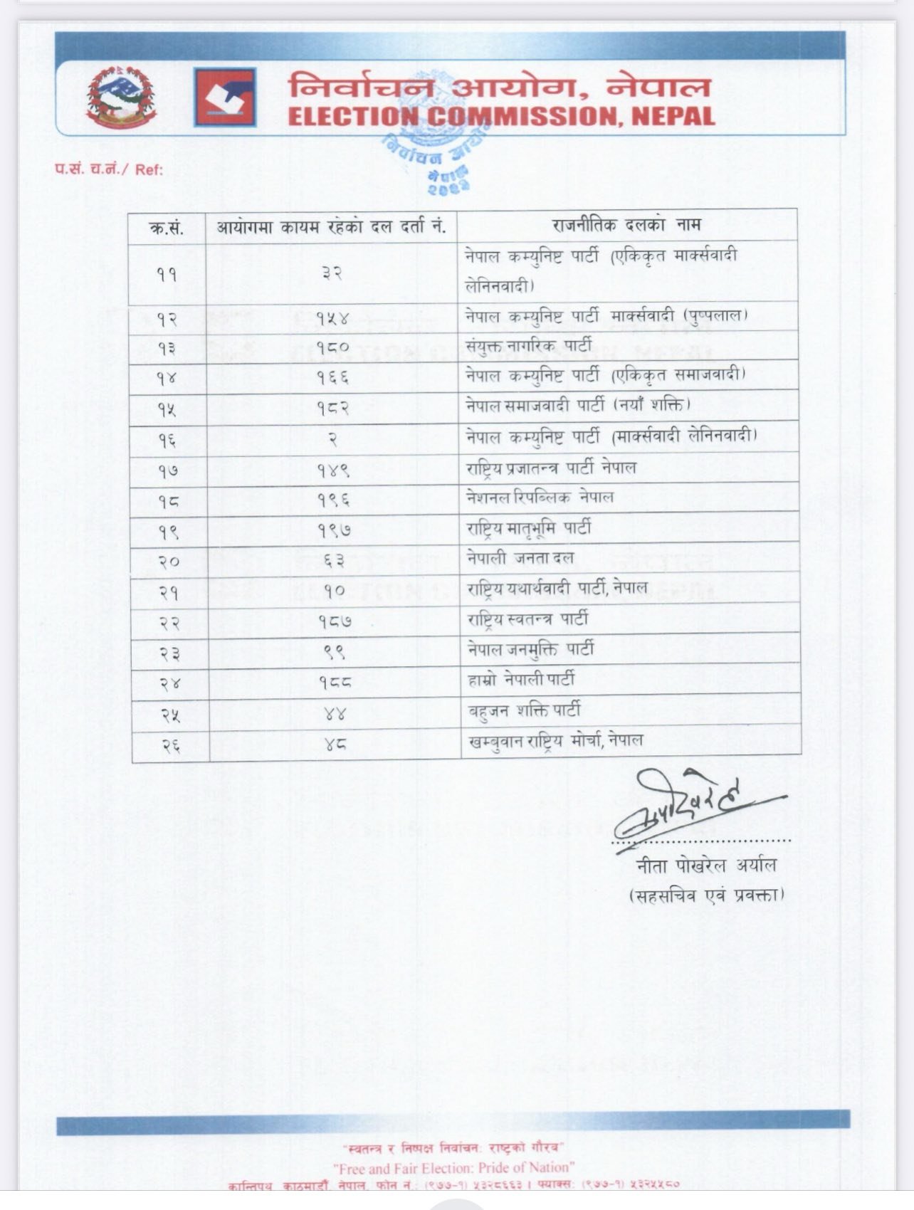 नेपालको संविधानको धारा २६९ र राजनीतिक दल सम्बन्धी ऐन, २०७३ को दफा ४ बमोजिम २६ दल दर्ता भएका आयोगले जनाएको छ ।