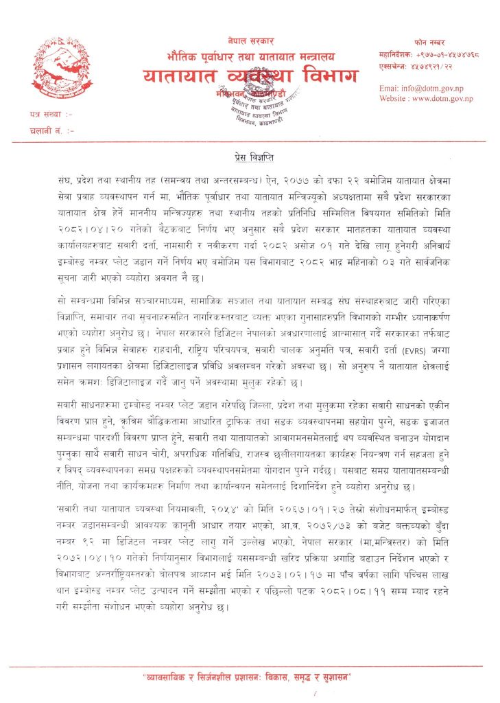 ‘इस्बोस्ड नम्बर प्लेट जडान सम्बन्धमा सम्पूर्ण सरकारी, निजी र सार्वजनिक सवारी साधनमा क्रमशस् जोड्दै लैजाने निर्णय भएको तर, मिति २०८२ असोज १ गतेदेखि जडान नगरेको खण्डमा तुरुन्त जरिवाना वा कारबाहीमा परिने भन्ने भ्रम समेत उत्पन्न भएको विषयलाई तत्काललाई कुनै किसिमको दण्डरजरिवाना नगरिने व्यहोरा स्पष्ट पारिन्छ,’ विभागका महानिर्देशक राजिव पोखरेलद्वारा जारी विज्ञप्तिमा उल्लेख छ ।