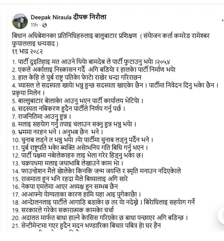 जिल्ला कमिटी काठमाडौंका अध्यक्ष दीपक निरौलाले ओलीको भनाइको ४८ बुँदामा फेहरिस्त सामाजिक सञ्जालमा सार्वजनिक गरेका छन् । नेता निरौलाका अनुसार ओलीले आफ्नो अधिकांश मन्तव्य पूर्वराष्ट्रपति विद्यादेवी भण्डारी र उनको पक्षमा उभिएका नेता लक्षित गरेका छन् ।