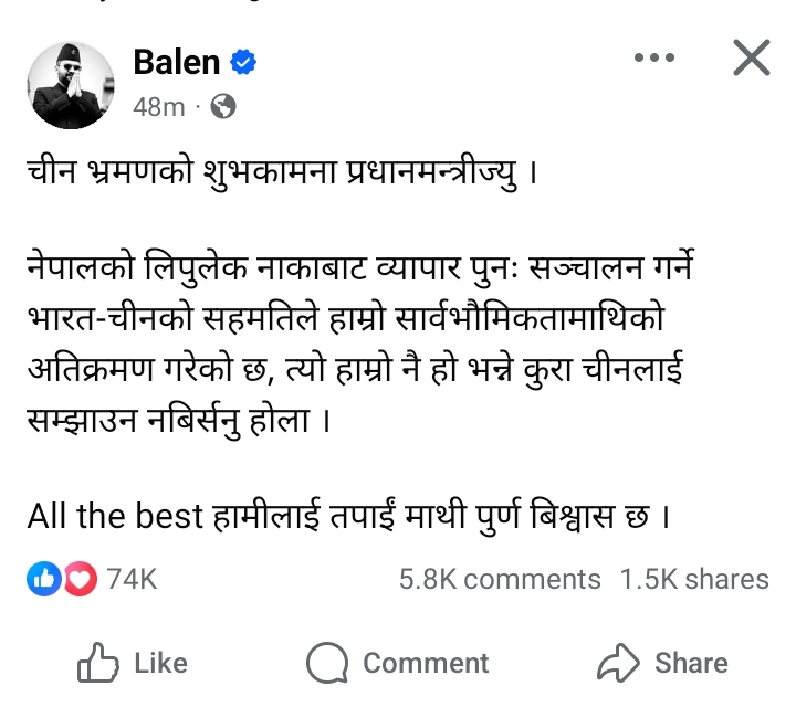 उनले लेखेका छन्– चीन भ्रमणको शुभकामना प्रधानमन्त्रीज्यु । नेपालको लिपुलेक नाकाबाट व्यापार पुनः सञ्चालन गर्ने भारत–चीनको सहमतिले हाम्रो सार्वभौमिकतामाथिको अतिक्रमण गरेको छ, त्यो हाम्रो नै हो भन्ने कुरा चीनलाई सम्झाउन नबिर्सनु होला ।