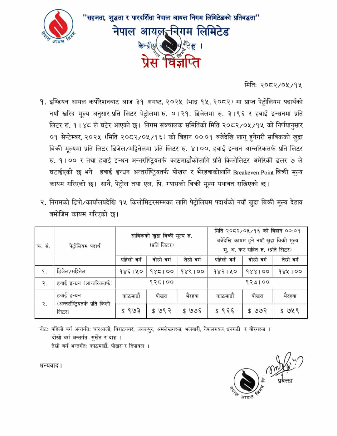 आजदेखि लागू हुने गरी डिजेलरमट्टीतेलमा प्रति लिटर रु। ४, हवाई इन्धन आन्तरिकतर्फ प्रति लिटर रु। १ र तथा हवाई इन्धन अन्तर्राष्ट्रियतर्फ काठमाडौँको लागि प्रति किलोलिटर अमेरिकी डलर ७ ले घटाइएको छ ।