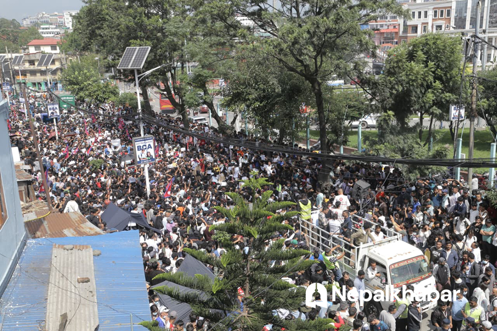 भ्रष्टाचार, बेथिती र सामाजिक सञ्जालमा सरकारले प्रतिबन्ध लगाएको विरोधमा स्वस्स्फूर्त सडकमा उत्रिएका युवाहरुको जुलुस माइतीघरबाट नयाँबानेश्वरतर्फ अघि बढेको छ ।