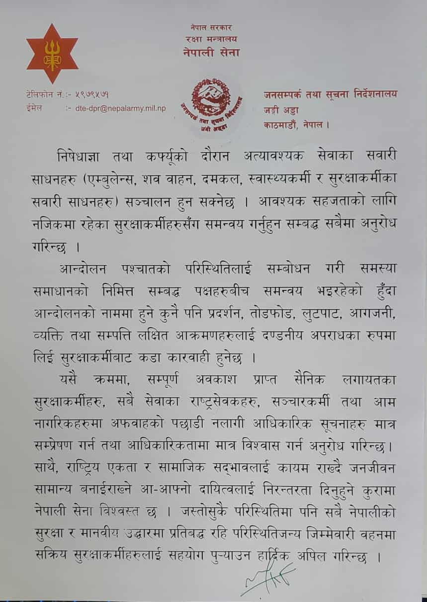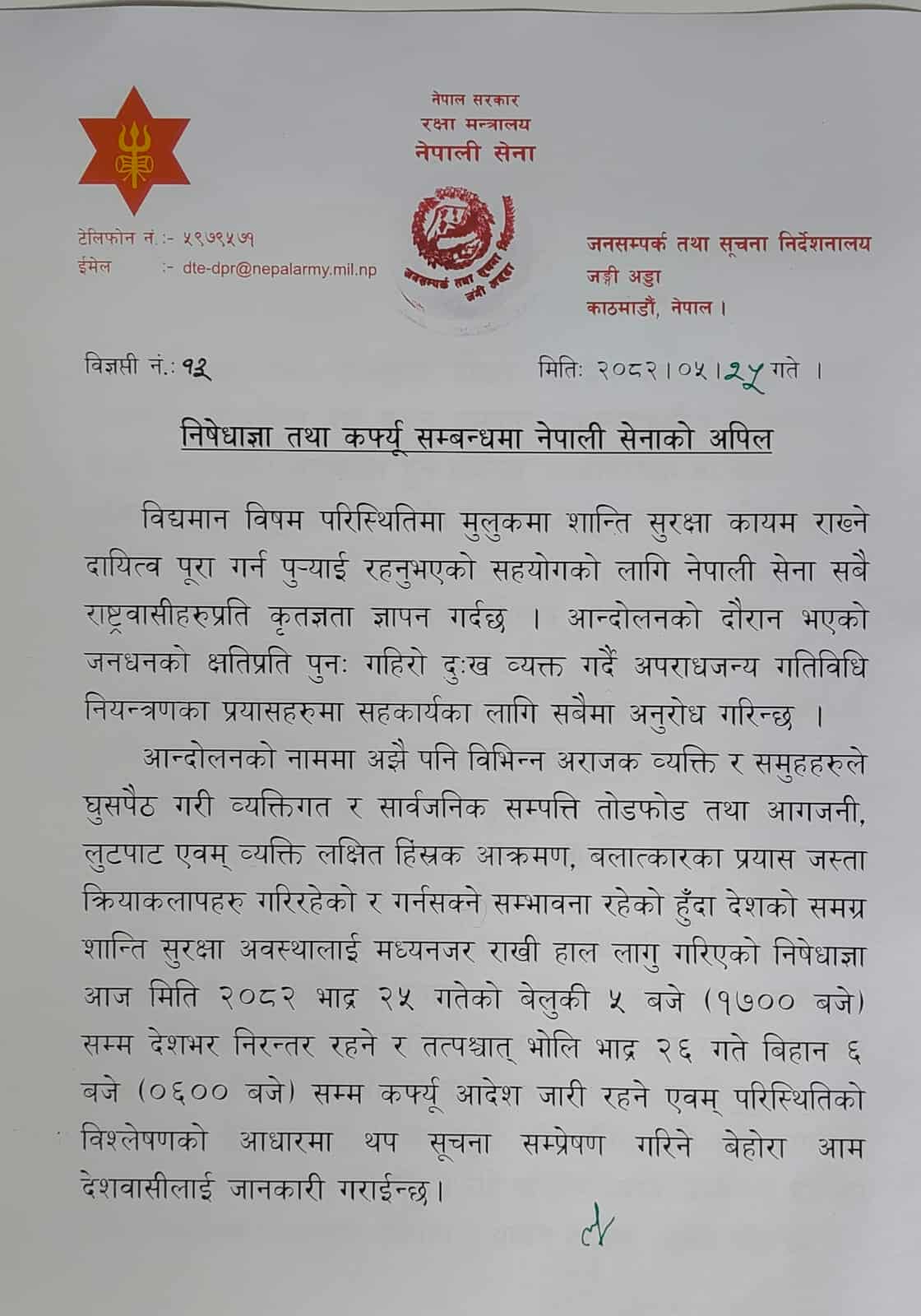 नेपाली सेनाको जनसम्पर्क तथा सूचना निर्देशनालयले आज बिहान सूचना जारी गर्दै शान्ति सुरक्षा कायम राख्ने उद्देश्यले निषेधाज्ञा तथा कर्फ्युको अवधि थप गरिएको जनाएको हो।