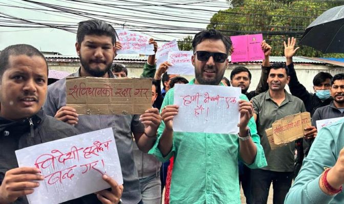 काठमाडौँ । नेपाली कांग्रेसको भ्रातृ संगठन नेपाल विद्यार्थी संघले संविधानको रक्षा गर्न माग गर्दै मीनभवनमा प्रदर्शन गरेको छ ।