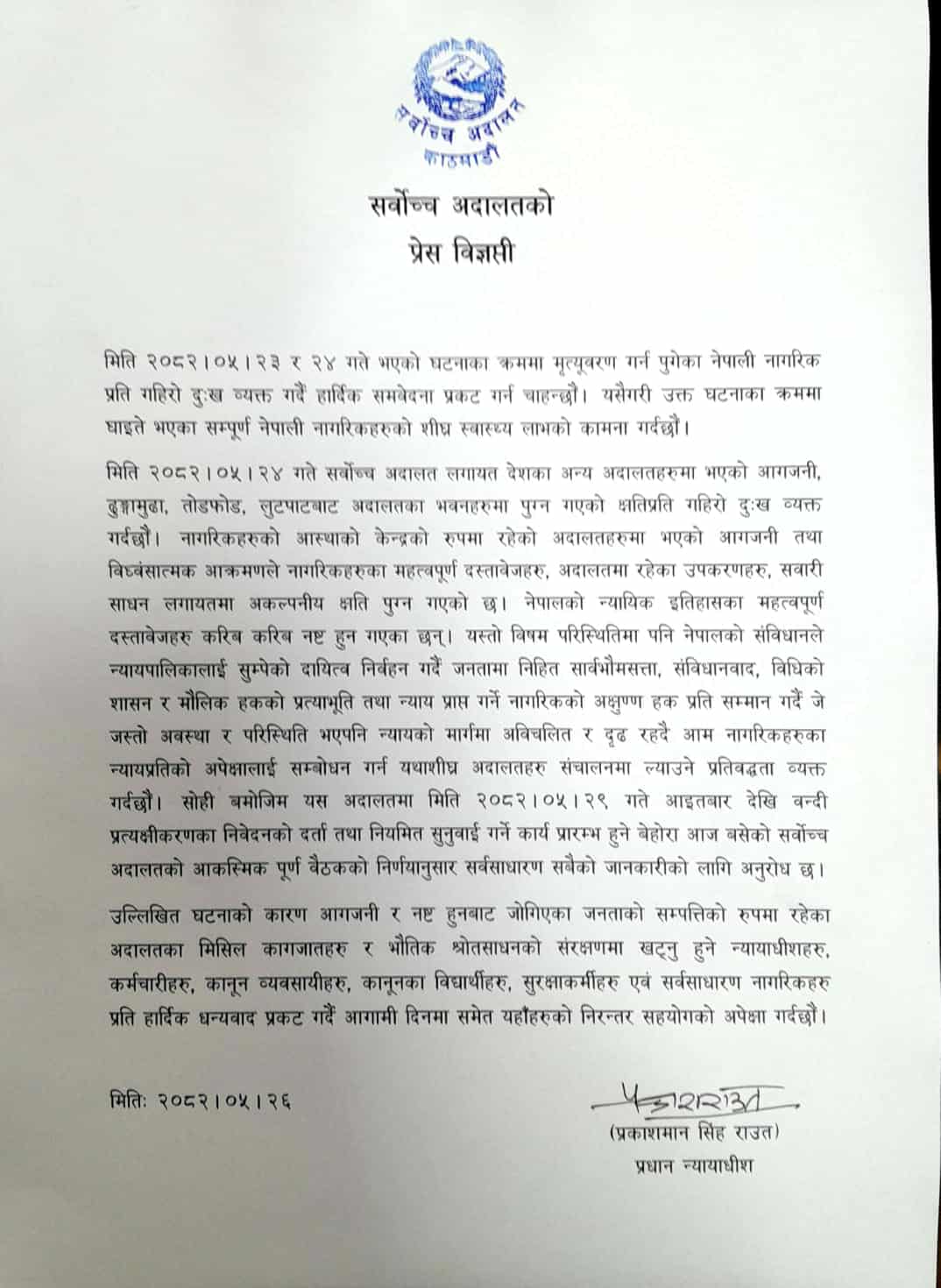 सर्वोच्चमा भएको आगजनीबाट न्यायिक इतिहासका महत्त्वपूर्ण दस्तावेजहरू नष्ट भएको भए पनि संविधानले दिएको जिम्मेवारी पूरा गर्न अदालत प्रतिबद्ध रहेको समेत विज्ञप्तिमा उल्लेख गरिएको छ।