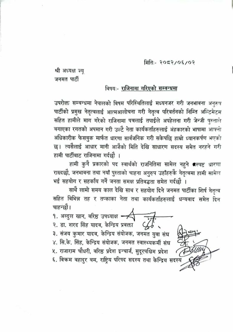 उपाध्यक्ष अब्दुल खान, प्रवक्ता डा। शरदसिं यादव, युवा संघका केन्द्रीय संयोजक सीके सिंह, सुदूरपश्चिम इञ्चार्ज राजाराम चौधरी र राष्ट्रिय परिषद सदस्य विक्रमबहादुर बमले पार्टी छाडेका हुन् ।