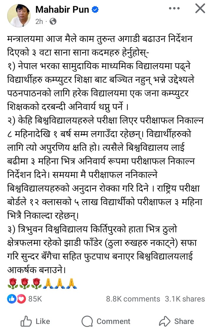 सामाजिक सञ्जालमार्फत कम्प्युटर शिक्षकको दरबन्दी थपलगायत तीनवटा निर्णयहरु सार्वजनिक गरेका हुन् ।