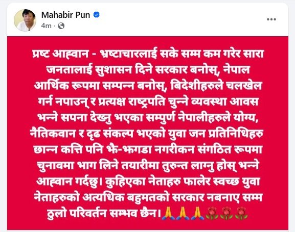 सामाजिक सञ्जालमार्फत उनले आगामी निर्वाचनबाट स्वच्छ युवा नेताहरुको अत्यधिक बहुमतको सरकार बनाउन आग्रह गरेका छन् ।