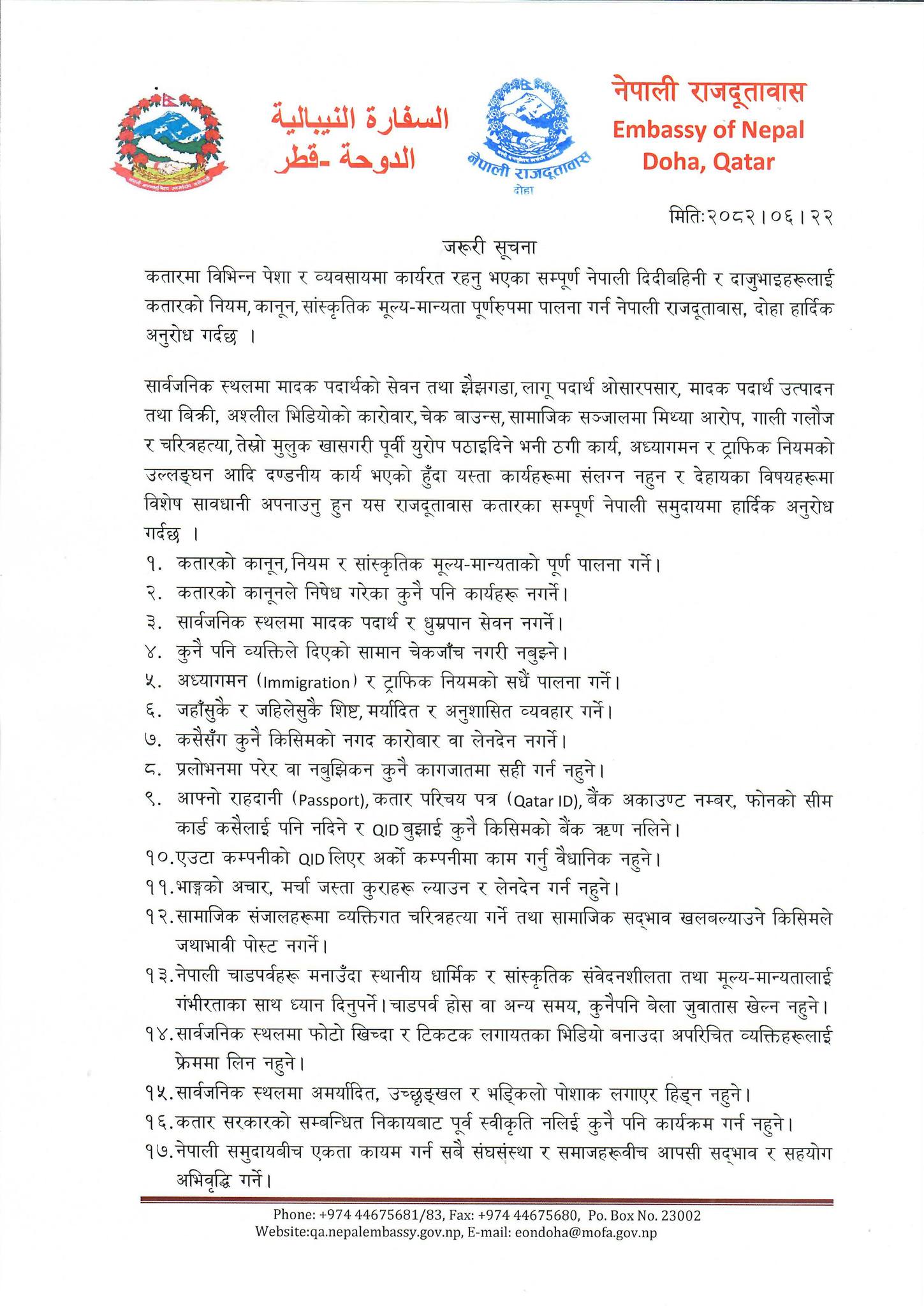 दूतावासले आज विज्ञप्ति जारी गर्दै भनेको छ, “कतारमा विभिन्न पेसा र व्यवसायमा कार्यरत रहनु भएका सम्पूर्ण नेपाली दिदीबहिनी र दाजुभाइहरूलाई कतारको नियम, कानुन, सांस्कृतिक मूल्य–मान्यता पूर्ण रूपमा पालना गर्न नेपाली राजदूतावास, दोहा हार्दिक अनुरोध गर्दछ ।”
