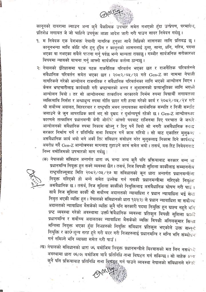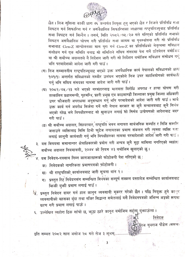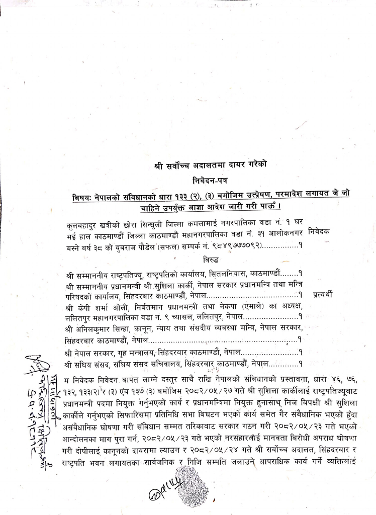प्रतिनिधिसभा विघटन र सरकार गठन असंवैधानिक ठहर गर्दै बदर गर्न रिटमा माग गरेको एकजना निवेदक युवराज पौडेलले बताए ।