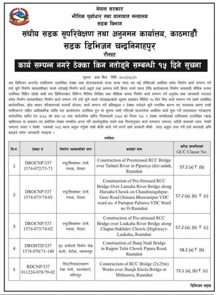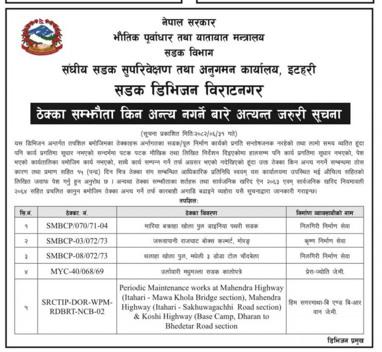 सडक डिभिजन कार्यालय विराटनगर, चन्द्रनिगाहपुर तथा निर्देशनालयले पाँचरपाँच र नुवाकोटले २ वटा गरी १७ वटा ठेक्का किन नतोड्ने रु भन्दै शुक्रबार सार्वजनिक सूचना जारी गरेका छन् । ठेका तोड्न प्रक्रिया बढाइएका अधिकांश पुल निर्माणका रहेका छन् ।