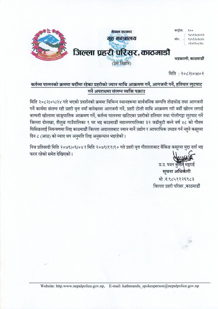 काठमाडौं । जेन-जी आन्दोलनका क्रममा भदौ २४ गते तीनकुनेका प्रहरीमाथि आक्रमण गर्ने र प्रहरीको बर्दी खोल्न लगाउने गौतम घिसिङ नामका व्यक्ति पक्राउ परेका छन् ।