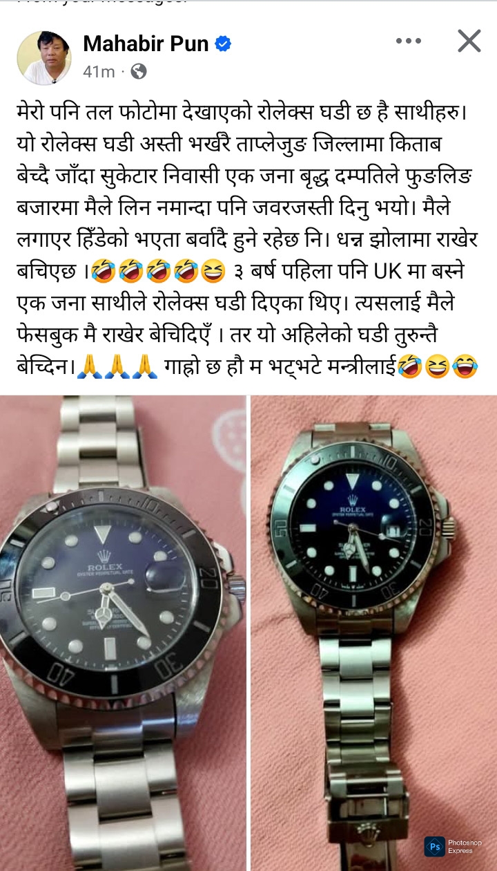 उनले भनेका छन्, ‘ मेरो पनि तल फोटोमा देखाएको रोलेक्स घडी छ है साथीहरु। यो रोलेक्स घडी अस्ती भर्खरै ताप्लेजुङ जिल्लामा किताब बेच्दै जाँदा सुकेटार निवासी एक जना बृद्ध दम्पतिले फुङलिङ बजारमा मैले लिन नमान्दा पनि जवरजस्ती दिनु भयो।’