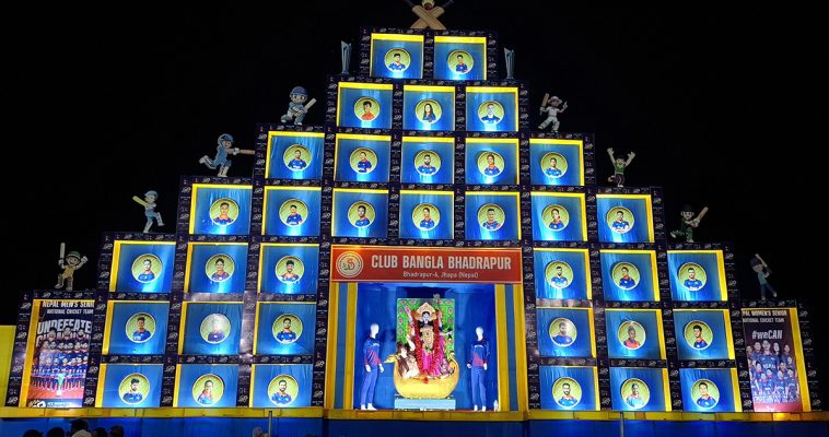 भद्रपुर । झापाको भद्रपुर नगरपालिका–६ मा नेपाली राष्ट्रिय क्रिकेट खेलाडीको तस्बिर राखेर आकर्षक कालीपूजा पण्डाल निर्माण गरिएको छ ।