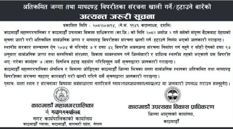 काठमाडौं महानगरपालिका क्षेत्रभित्र र सिमाना जोडिएका काठमाडौं जिल्लाभित्रका यस्ता सार्वजनिक स्थलमा अतिक्रमित तथा मापदण्ड विपरीतका संरचना नहटाए कारबाही गरी खाली गरिने यसै सूचनामार्फत जानकारी गराइन्छ’ सूचनामा भनिएको छ।