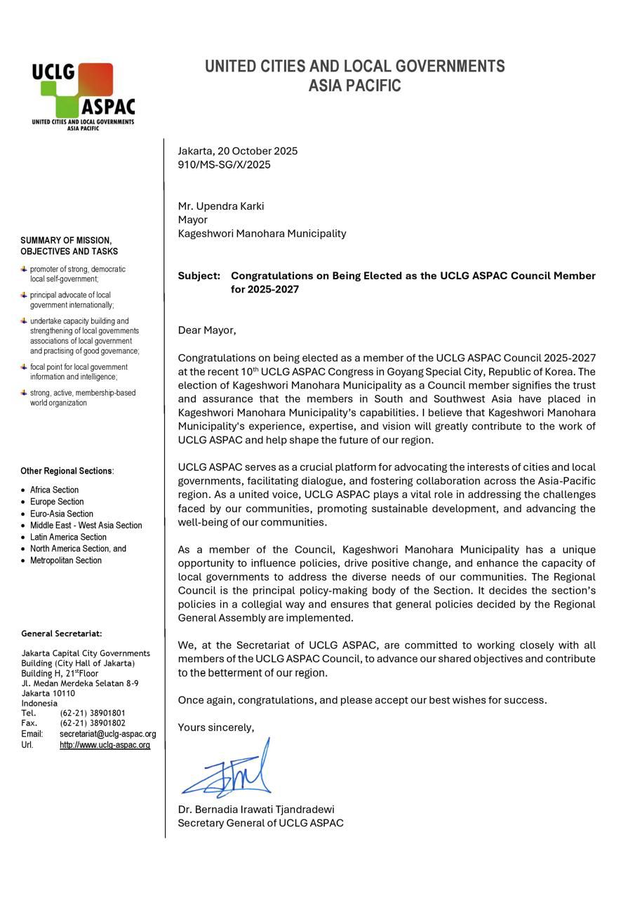 पत्रमा कागेश्वरी मनोहरा नगरपालिकाको अनुभव, दक्षता र दृष्टिकोणले सम्पूर्ण एशिया–प्रशान्त क्षेत्रमा स्थानीय सरकारहरूको सशक्तिकरण तथा सहकार्य प्रवर्द्धनमा महत्वपूर्ण योगदान पुर्याउने विश्वास व्यक्त गरिएको छ ।
