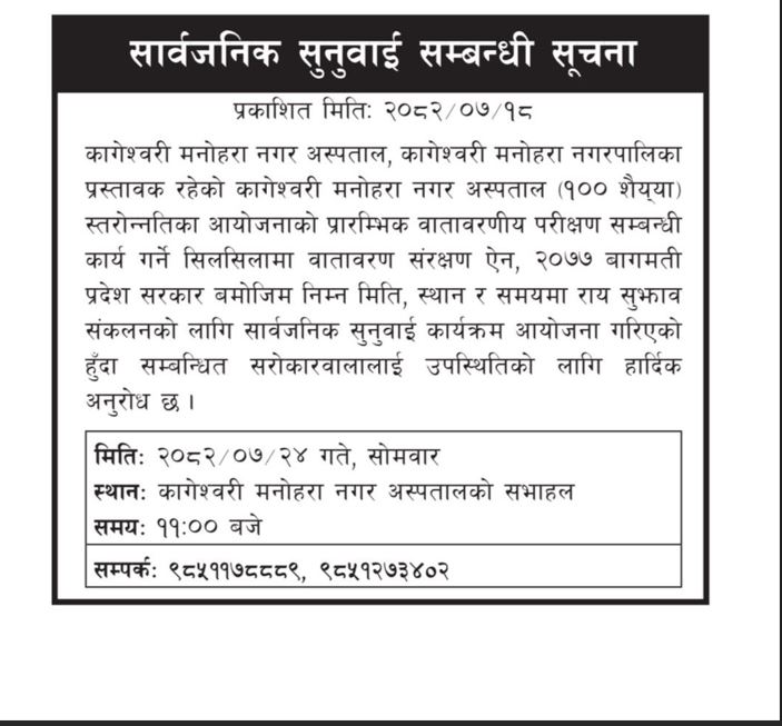 काठमाडौं । कागेश्वरी मनोहरा नगरपालिकाद्धारा संचालित नगर अस्पतालले सार्वजनिक सुनुवाई कार्यक्रम आयोजना गरेको छ । १०० शैय्यामा स्तरोन्नतिको प्रक्रियामा रहेको अस्पतालले आगामी कात्तिक २४ गते राय सुझाव संकलनका लागि सार्वजनिक सुनुवाई कार्यक्रम आयोजना गरेको हो ।