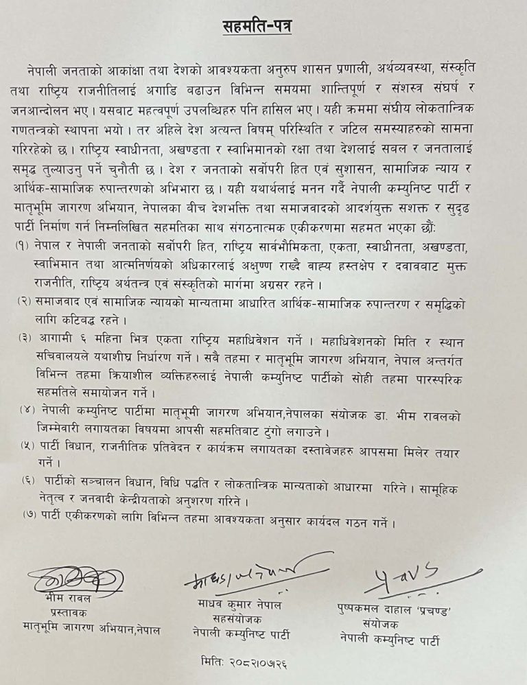 आज पेरिसडँडामा आयोजित कार्यक्रममा हस्ताक्षर भएको हो। सहमति पत्रमा नेपाली कम्युनिस्ट पार्टीका संयोजक पुुष्पकमल दाहाल ‘प्रचण्ड’, सहसंयोजक माधव नेपाल र रावलले हस्ताक्षर गरेका छन्।