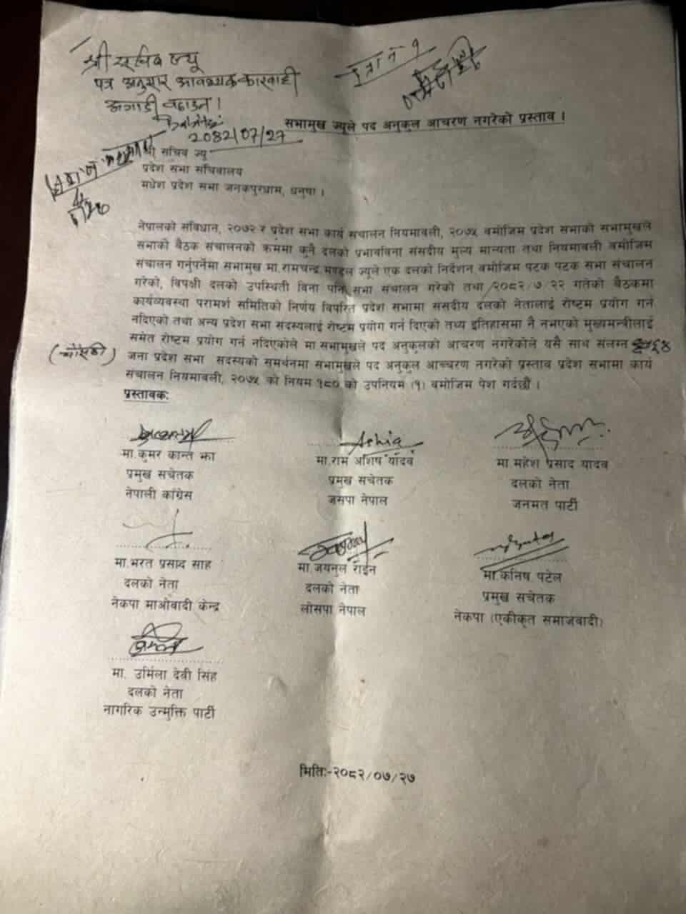 ६४ जना प्रदेसभा सदस्यको समर्थनमा सभामुखले पदअनुकुल आचरण नगरेको प्रस्ताव प्रदेशसभामा कार्यसञ्चालन नियमावली २०७५ को नियम १८० को उपनियम ९१० बमोजिम पेश गर्दछौँ, सो प्रस्तावमा भनिएको छ ।