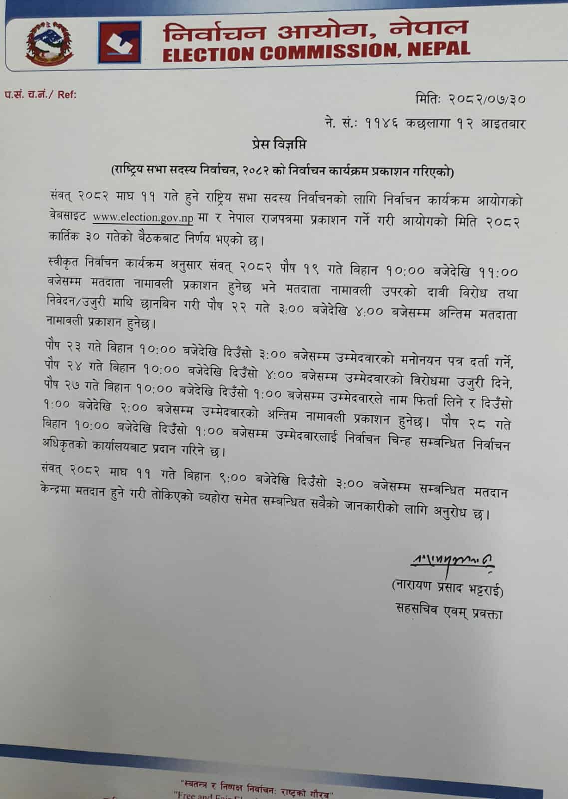 काठमाडौं । निर्वाचन आयोगले राष्ट्रिय निर्वाचनका लागि आगामी पुस २३ गते उम्मेदवारी मनोनयन दर्ताको कार्यसूची तय गरेको छ।