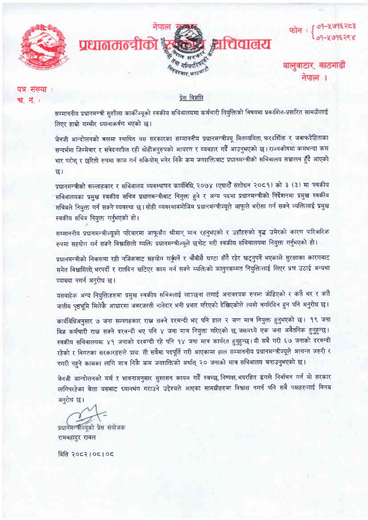 ‘राज्यकोषमा कमभन्दा कम भार परोस् र छरितो रूपमा काम गर्न सकियोस् भनेर निकै कम जनशक्तिबाट प्रधानमन्त्रीको सचिवालय सञ्चालन हुँदै आएको छ,’ रावलले जारी गरेको विज्ञप्तिमा भनिएको छ, ‘प्रधानमन्त्रीको सल्लाहकार र सचिवालय व्यवस्थापन कार्यविधि, २०७४ ९एघारौँ संशोधन २०८१० को ३ ९३० मा ‘स्वकीय सचिवालयका प्रमुख स्वकीय सचिव प्रधानमन्त्रीबाट नियुक्त हुने र अन्य पदमा प्रधानमन्त्रीको निर्देशनमा प्रमुख स्वकीय सचिवले नियुक्त गर्न सक्ने व्यवस्था छ। सोही व्यवस्थाबमोजिम प्रधानमन्त्रीज्यूले आफूले भरोसा गर्न सक्ने व्यक्तिलाई प्रमुख स्वकीय सचिव नियुक्त गर्नुभएको हो।’