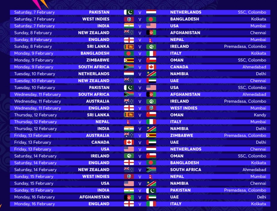 विश्वकपको पहिलो खेलमा फेब्रुअरी ७ मा पाकिस्तान र नेदरल्यान्ड प्रतिस्पर्धा हुनेछ। यो खेल कोलोम्बोमा हुनेछ ।