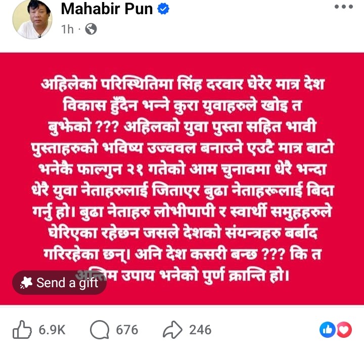 ‘अहिलेको परिस्थितिमा सिंहदरबार घेरेर मात्र देश विकास हुँदैन भन्ने कुरा युवाहरूले खोइ त बुझेको ? अहिलको युवा पुस्तासहित भावी पुस्ताहरूको भविष्य उज्ववल बनाउने एउटै मात्र बाटो भनेकै फाल्गुन २१ गतेको आम चुनावमा धेरैभन्दा धेरै युवा नेताहरूलाई जिताएर बुढा नेताहरूलाई बिदा गर्नु हो’, उनले लेखेका छन्, ‘बुढा नेताहरू लोभीपापी र स्वार्थी समूहहरूले घेरिएका रहेछन्, जसले देशको संयन्त्रहरू बर्बाद गरिरहेका छन्। अनि देश कसरी बन्छ ? कि त अन्तिम उपाय भनेको पूर्ण क्रान्ति हो।’