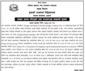सडक विभाग मातहतको हुलानी राजमार्ग निर्देशनालयअन्तर्गत योजना कार्यालय इटहरीले बिहीबार पुल निर्माणका लागि पप्पु महादेव खिम्तीको संयुक्त उपक्रम ९जेभी०सँग ठेक्का सम्झौता ठेक्का अन्त्य गरिएको सार्वजनिक सूचना जारी गरेको छ ।