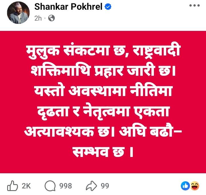 सामाजिक सञ्जालमार्फत उनले भनेका छन्– मुलुक संकटमा छ, राष्ट्रवादी शक्तिमाथि प्रहार जारी छ। यस्तो अवस्थामा नीतिमा दृढता र नेतृत्वमा एकता अत्यावश्यक छ। अघि बढौँ– सम्भव छ ।