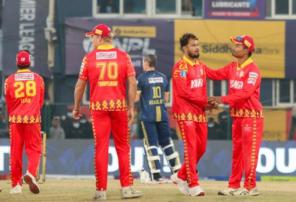 प्रतिश जिसीले ११ रन बनाए । ओपनर जर्ज मुन्से ‘डक’ भए । नारायण जोशीले पाँच रन थपे । कप्तान सन्दीप लामिछान एक बलमा छक्कासहित ६ रनमा अविजित रहे ।