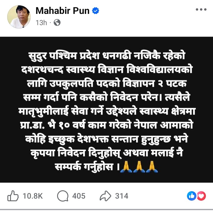 ‘सुदूरपश्चिम प्रदेश धनगढीनजिकै रहेको दशरथ चन्द स्वास्थ्य विज्ञान विश्वविद्यालयको उपकुलपति पदका लागि दुईपटक विज्ञापन गर्दा पनि कसैको निवेदन परेन’, मन्त्री पुनले फेसबुकमा लेखेका छन्, ‘मातृभूमिलाई सेवा गर्ने उद्देश्यले स्वास्थ्य क्षेत्रमा प्रा.डा.भई १० वर्ष काम गरेको कोही नेपाल आमाको देशभक्त सन्तान हुनुहुन्छ भने निवेदन दिनुहोस् अथवा मलाई नै सम्पर्क गर्नुहोस् ।’