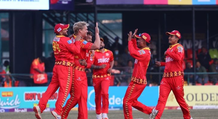 शाहव आलम ४ रनमा अविजित रहे । बलिङमा लुम्बिनीका कप्तान रोहित पौडेल र शेर मल्लले ३–३ तथा रुवेन ट्रम्पलम्यानले दुई र अभिषेश गौतमले एक विकेट लिए ।