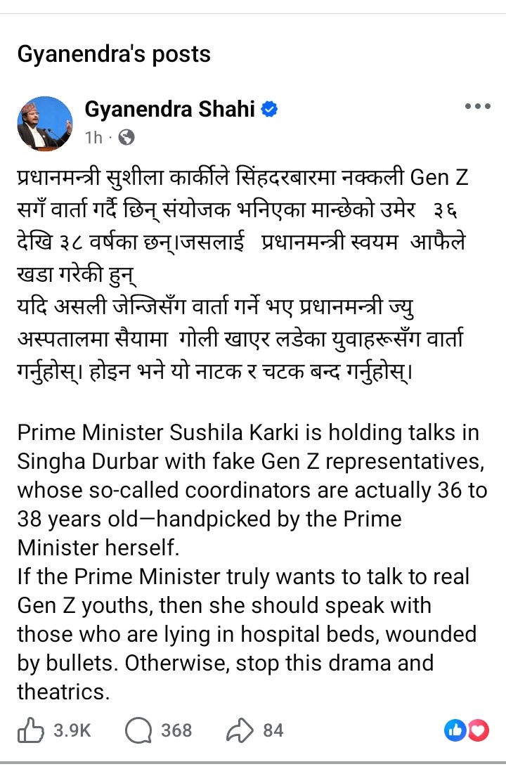 ‘प्रधानमन्त्री सुशीला कार्कीले सिंहदरबारमा नक्कली जेनजीसँग वार्ता गर्दै छिन् । संयोजक भनिएका मान्छेको उमेर ३६ देखि ३८ वर्षका छन्।जसलाई प्रधानमन्त्री स्वयम आफैले खडा गरेकी हुन् ’ उनले लेखेका छन्, ‘यदि असली जेन्जिसँग वार्ता गर्ने भए प्रधानमन्त्री ज्यु अस्पतालमा शय्यामा गोली खाएर लडेका युवाहरूसँग वार्ता गर्नुहोस्। होइन भने यो नाटक र चटक बन्द गर्नुहोस्।’