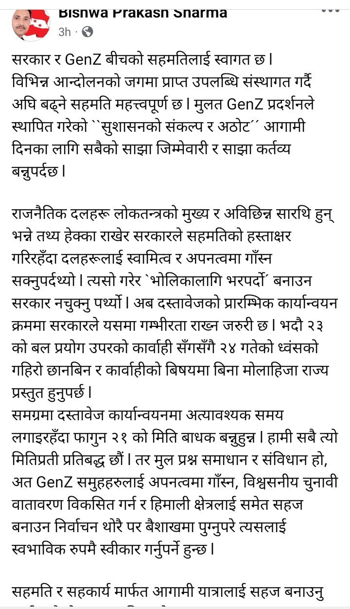 उनले जेनजीहरुसँग सरकारले गरेको सहमतिलाई समेत स्वागत गर्दै कार्यान्वयनमा फागुन २१ को निर्वाचनको मिति बाधक हुन नहुने पनि बताएका छन् ।