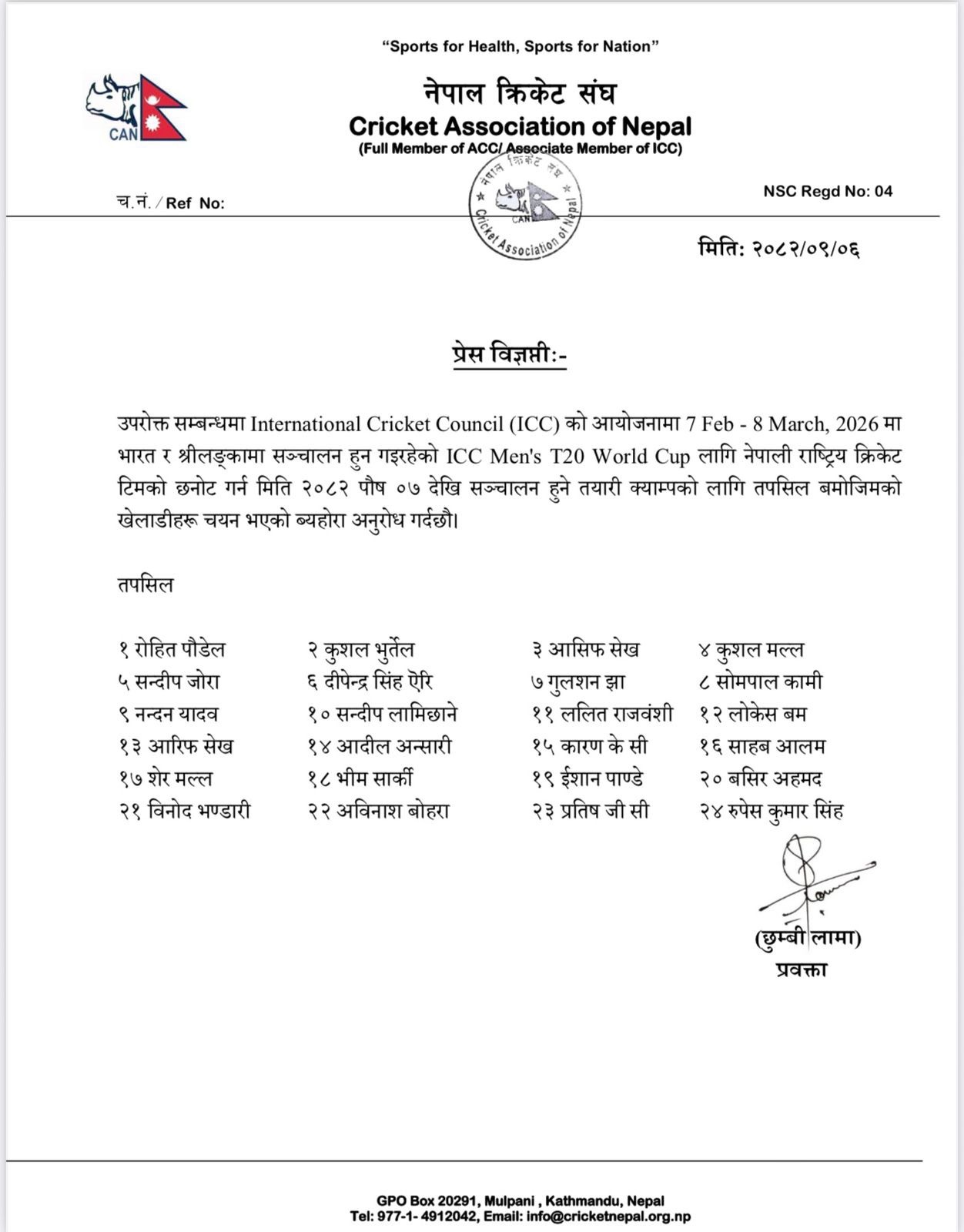 २४ सदस्यीय प्रारम्भिक टोलीमा शेर मल्ल, विनोद भण्डारी, इसान पाण्डे, रुपेश सिंह, अविनास बोहोराले पनि स्थान बनाएका छन्।