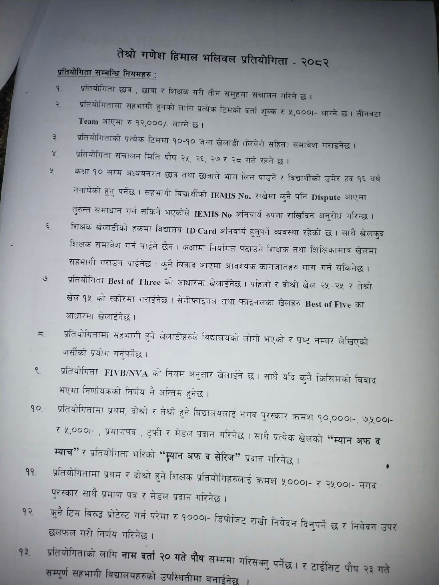 प्रतियोगिता छात्र, छात्रा र शिक्षक गरि तीन समुहमा संचालन गरिने छ । प्रतियोगितामा सहभागी हुनको लागि प्रत्येक टीमको दर्ता शुल्क ५ हजार लाग्ने छ । भने ३ वटा टीमको दर्ता शुल्क १२ हजार लाग्नेछ ।